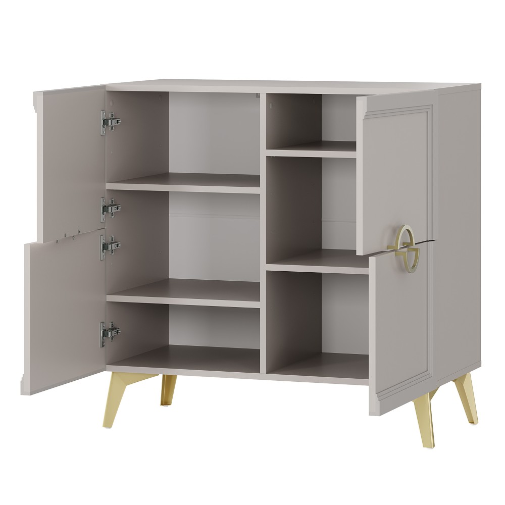— Фасады выполнены из ЛДСП в цвете «кашемир» толщиной 16 мм, а по краям фасады облицованы рамочным профилем из МДФ с рельефной фрезеровкой толщиной 26 мм.