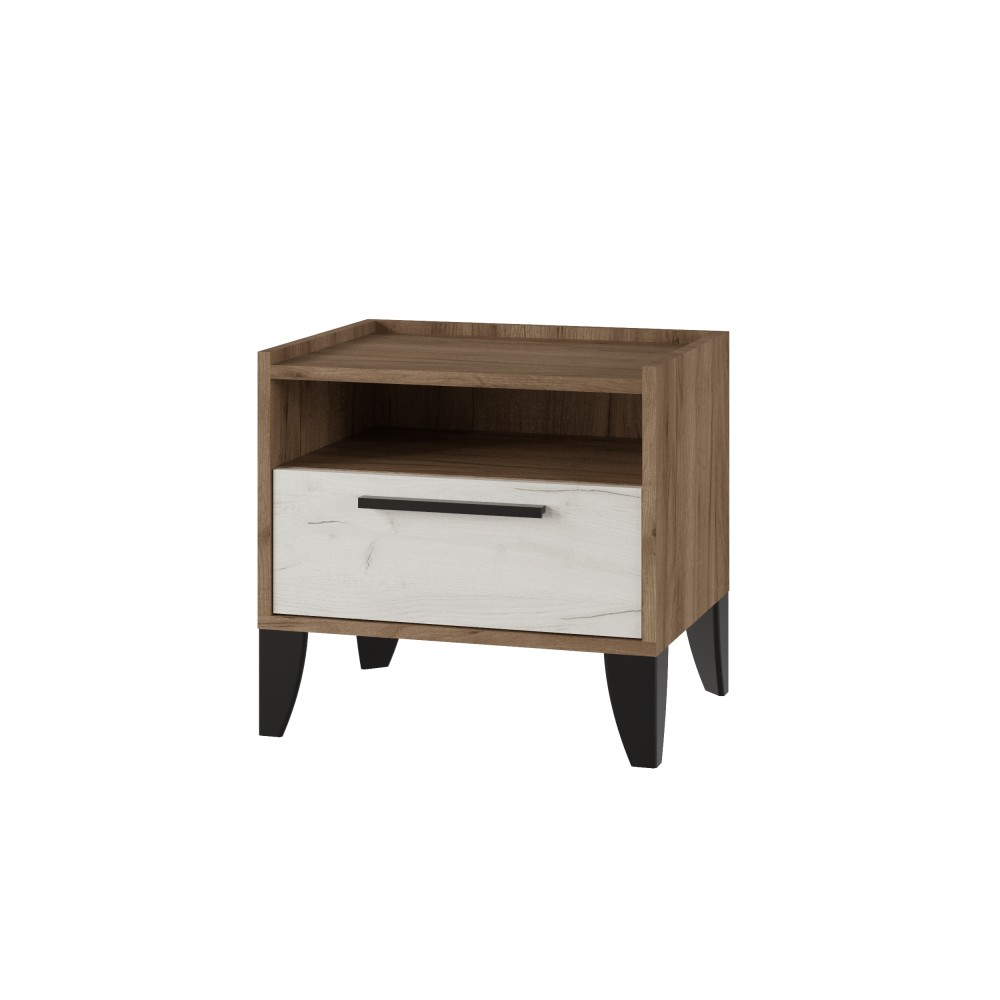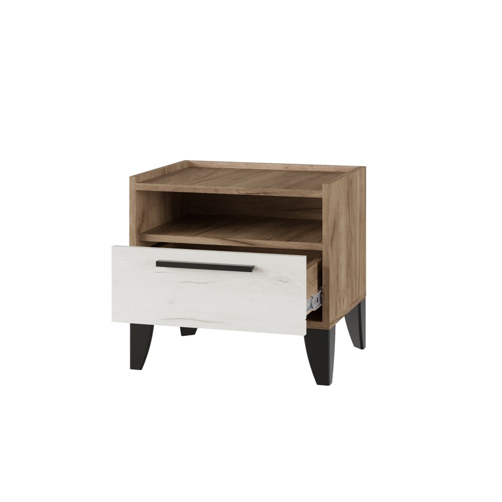 С помощью прикроватной тумбы можно по-новому обыграть интерьер спальни и добавить функциональности мебельному гарнитуру. Тумба Модена выполнена в современном стиле в декоре ясень анкор светлый. Темные высокие ножки и тонкая ручка на ящике добавляют модулю оригинальности. В ящике на шариковых направляющих Вы сможете разместить личные вещи, которыми привыкли пользоваться перед сном или после пробуждения. На поверхности тумбы хватит места для ночника икниги.