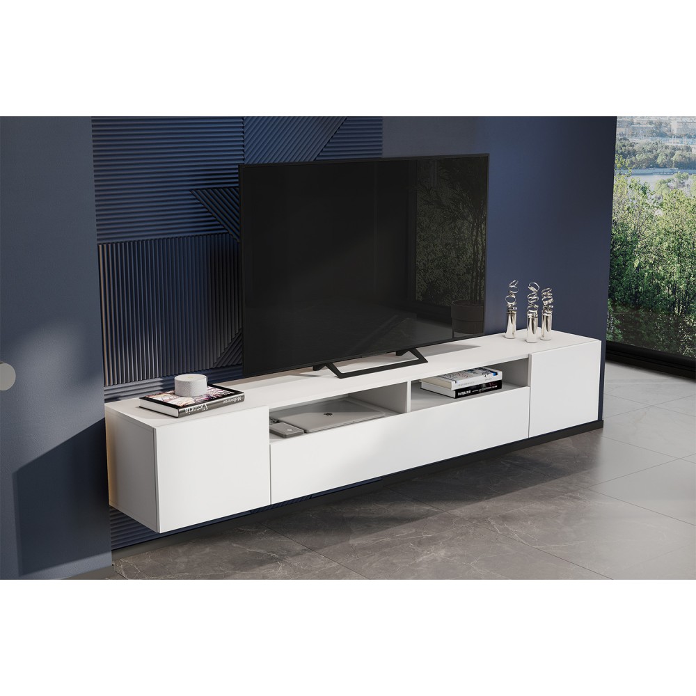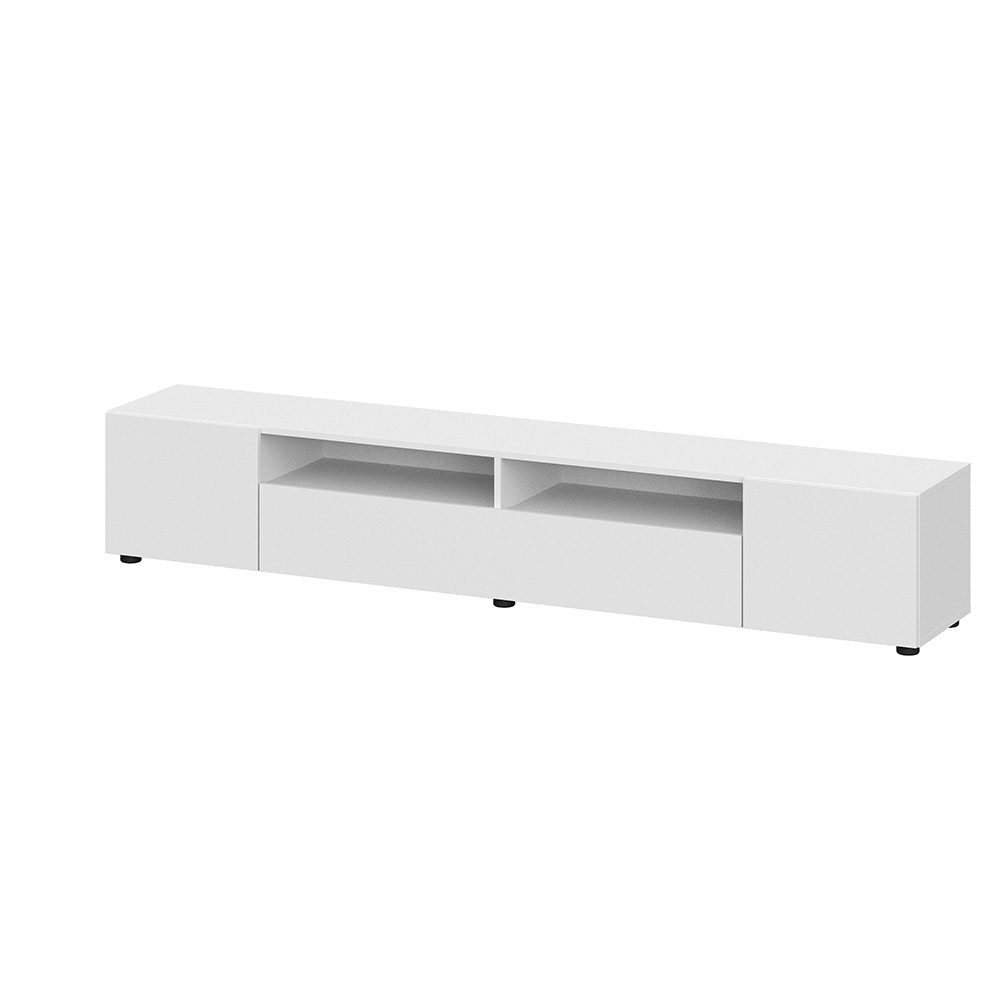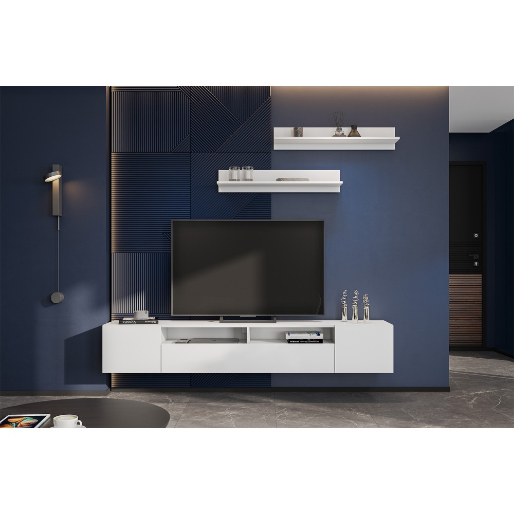 Тумба под ТВ из модульной серии Денвер в белом цвете дополнит гостиную в сочетании со шкафами и навесными полками или навесными шкафами, на выбор.