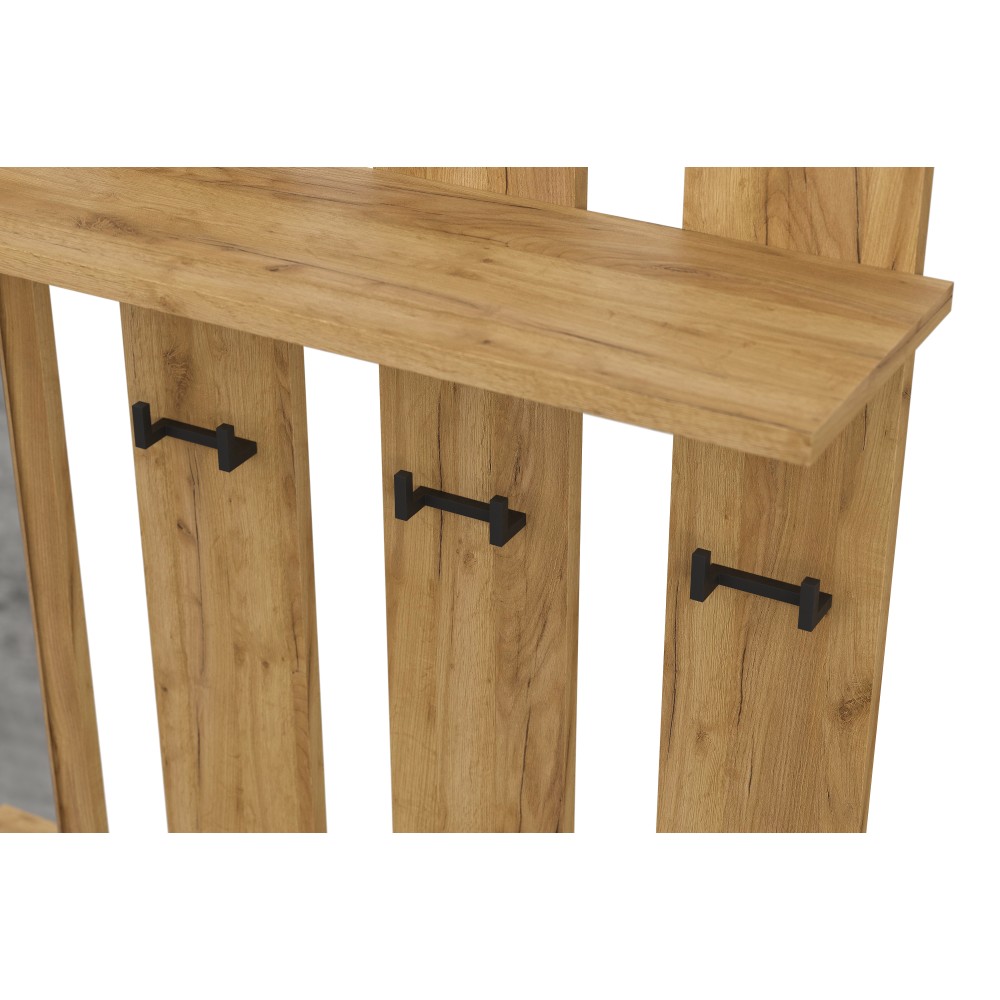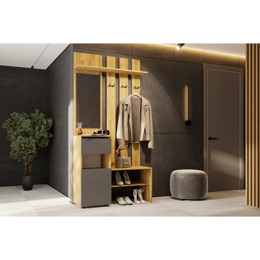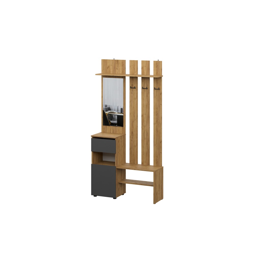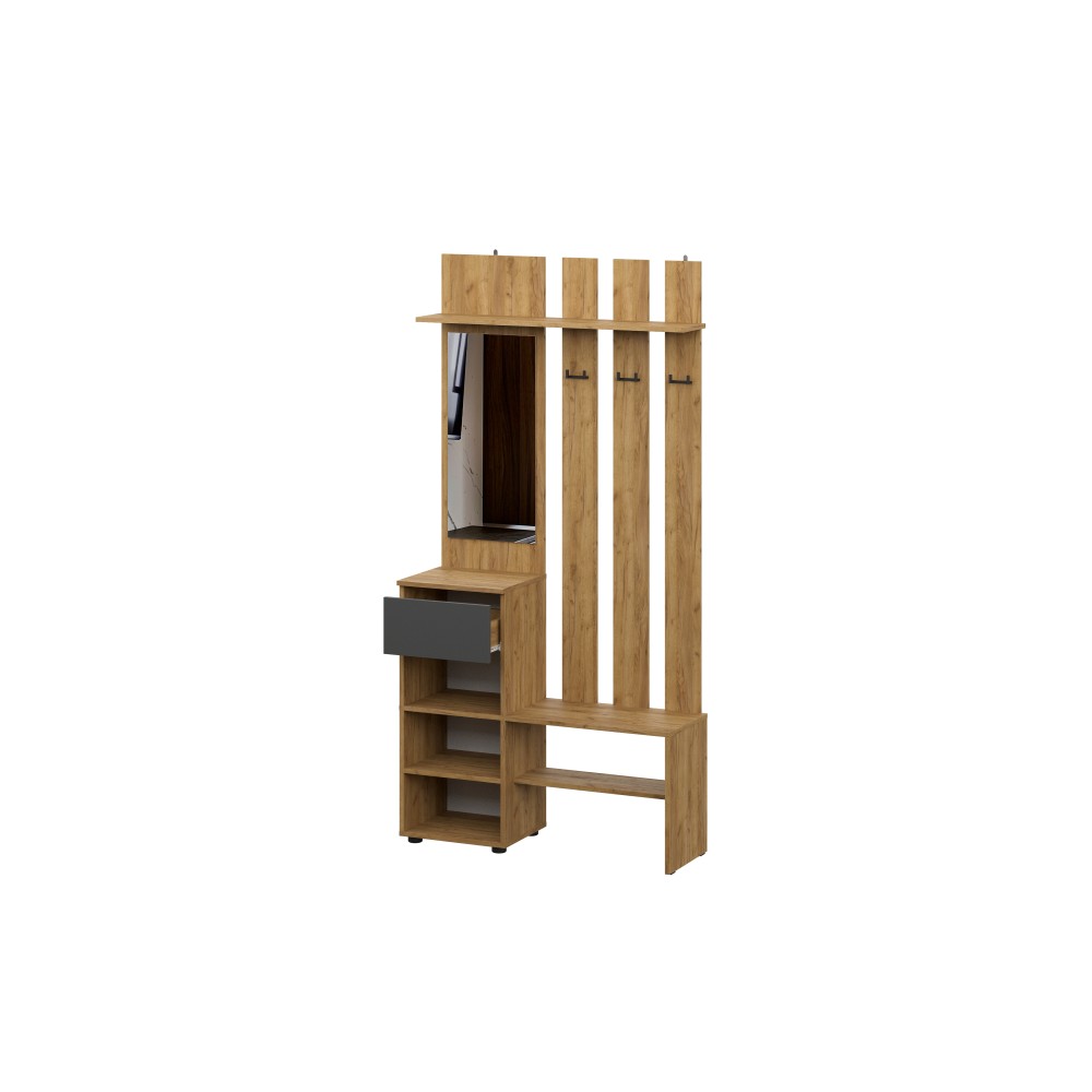 Вешалка Денвер в цвете дуб золотой/графит поможет организовать систему хранения гардероба в современном интерьере. Для вашего удобства предусмотрены двухрожковые крючки для повседневной верхней одежды, широкая верхняя полка для головных уборов и шарфов, ниша для обуви, а также выдвижной ящик. За распашным фасадом находятся небольшие полки. Зеркало позволит оценить внешний вид перед выходом из дома.