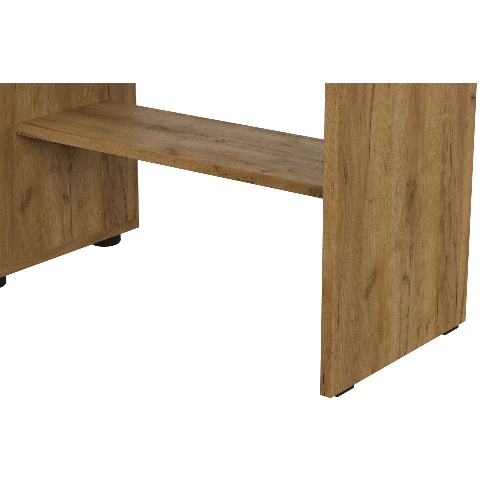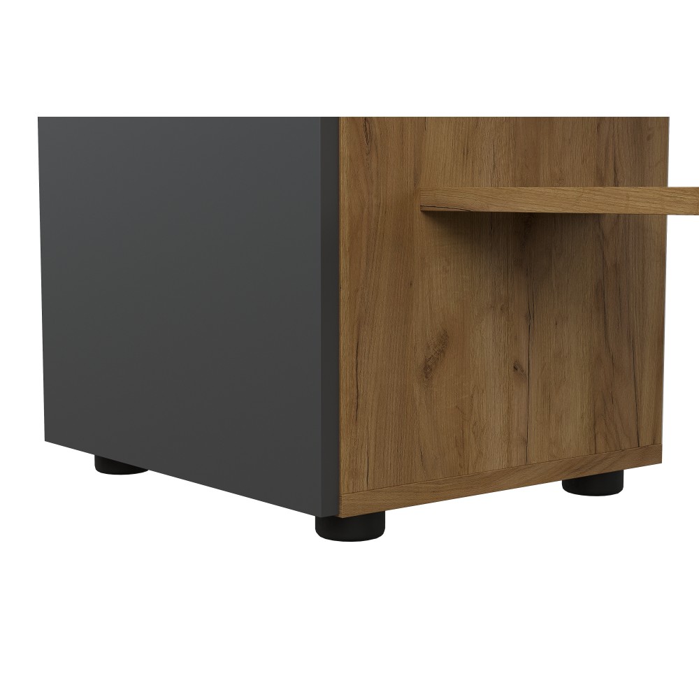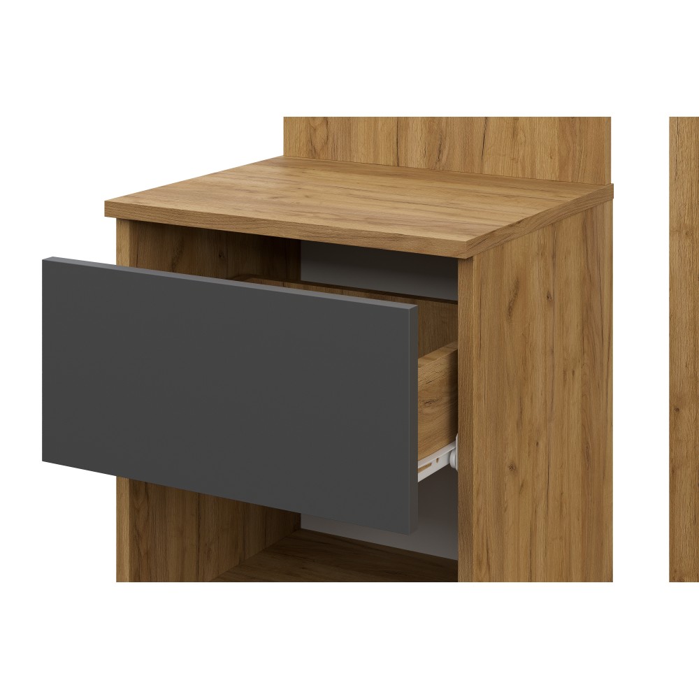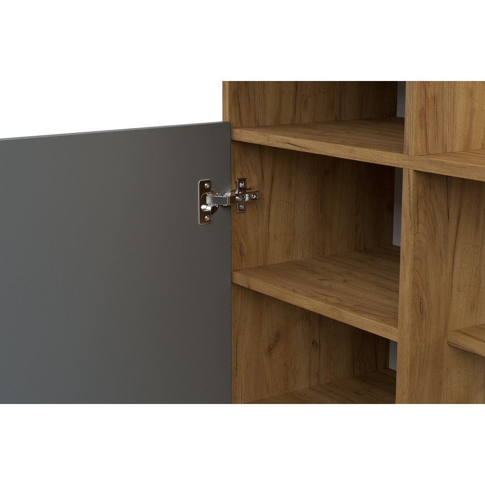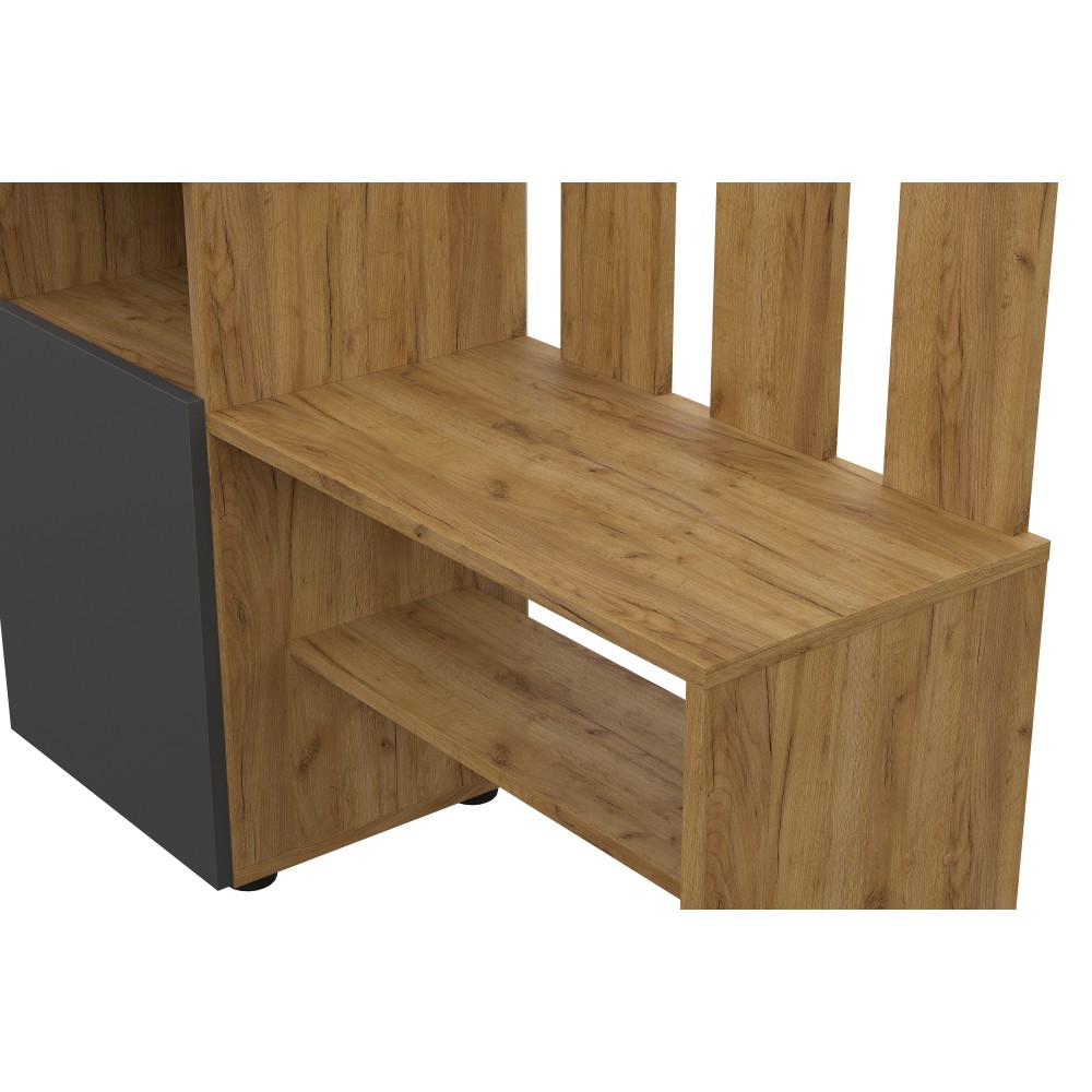 Вешалка Денвер в цвете дуб золотой/графит поможет организовать систему хранения гардероба в современном интерьере. Для вашего удобства предусмотрены двухрожковые крючки для повседневной верхней одежды, широкая верхняя полка для головных уборов и шарфов, ниша для обуви, а также выдвижной ящик. За распашным фасадом находятся небольшие полки. Зеркало позволит оценить внешний вид перед выходом из дома.